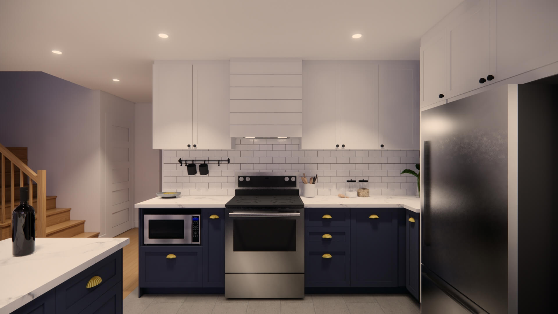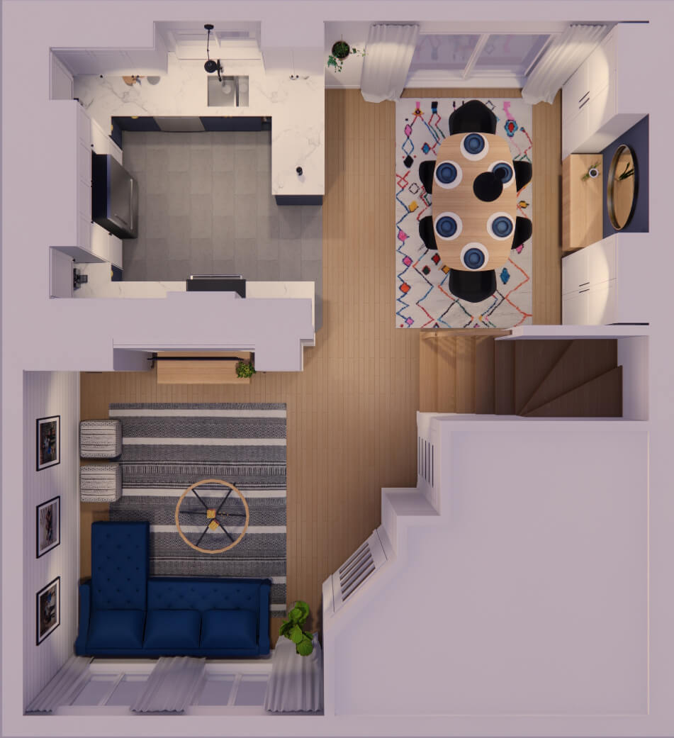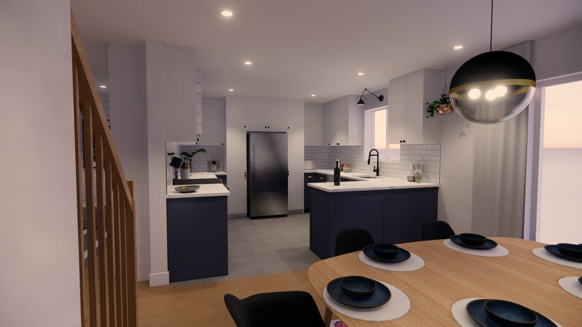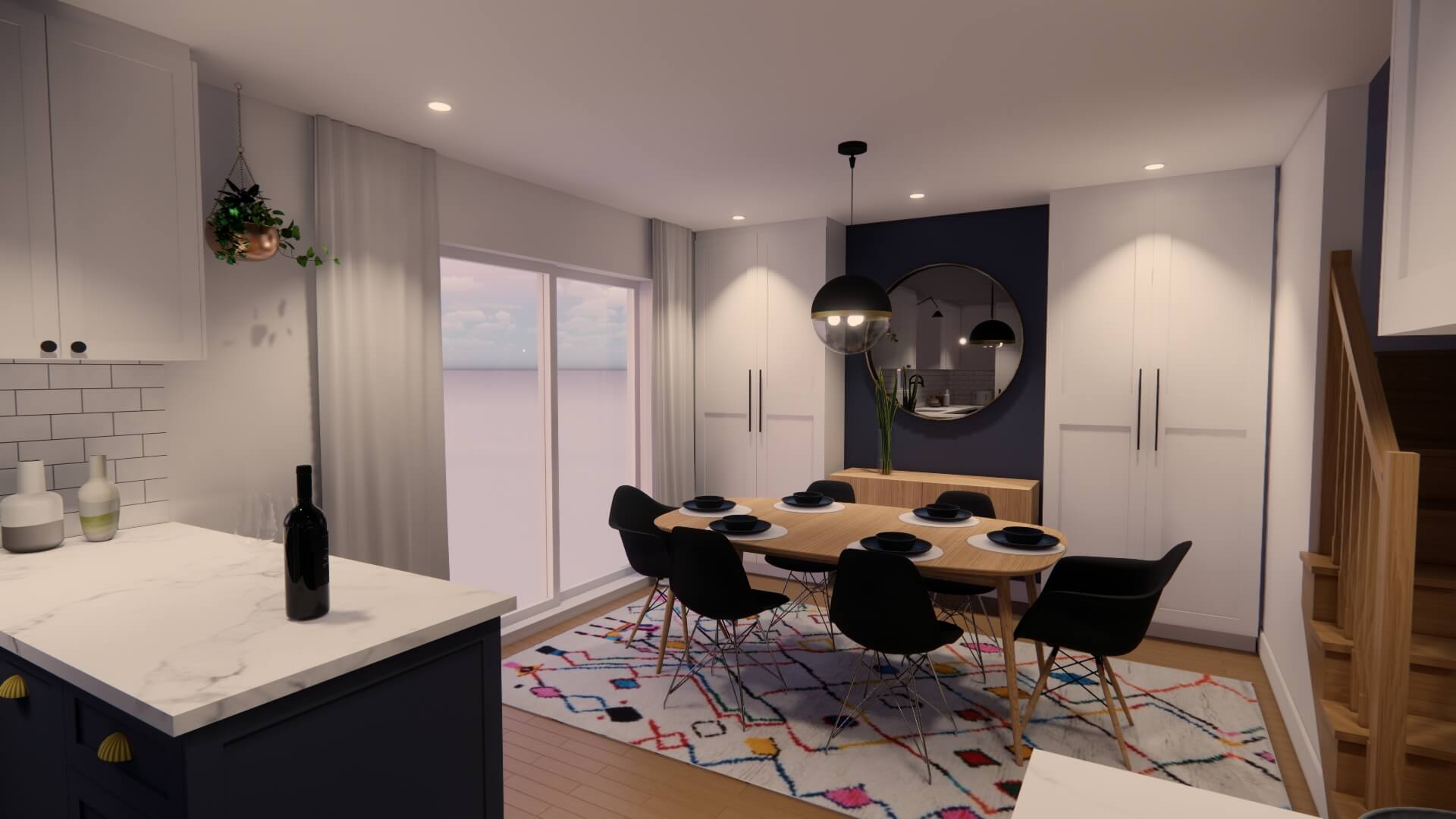 Le choix de matériaux légèrement texturés mais aux couleurs contrastantes laisse une ambiance lumineuse et vivante. L’intégration de la couleur marine, aux armoires de la cuisine ainsi qu’au mobilier, apporte une dose de personnalité à l’ensemble et s’harmonise bien avec les revêtements plus clairs qui composent l’enveloppe des pièces du rez-de-chaussée.