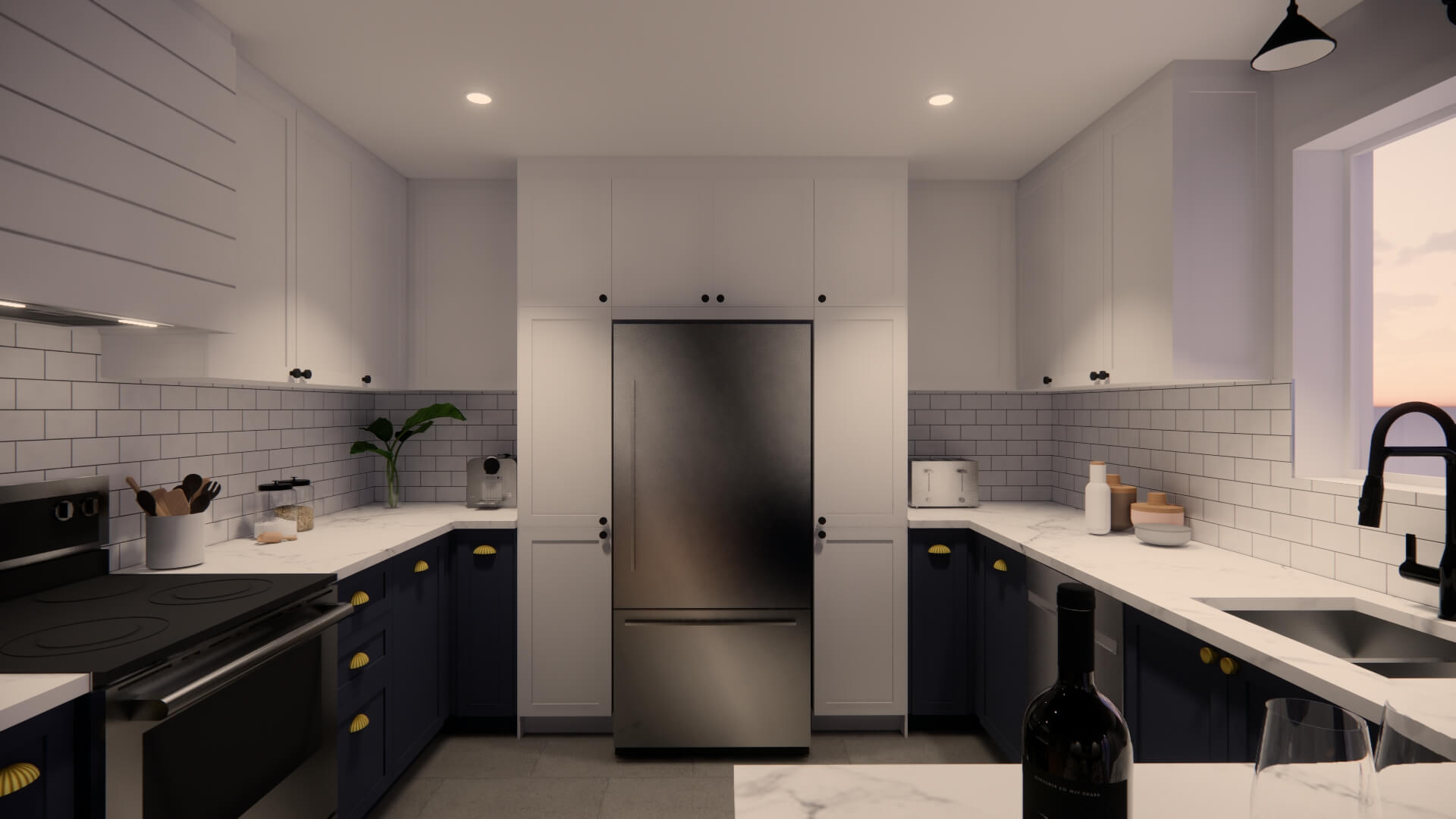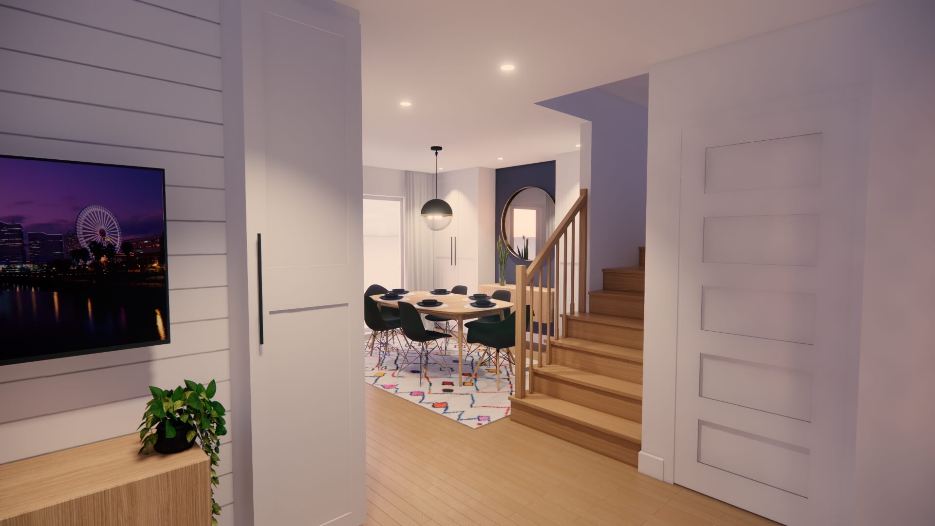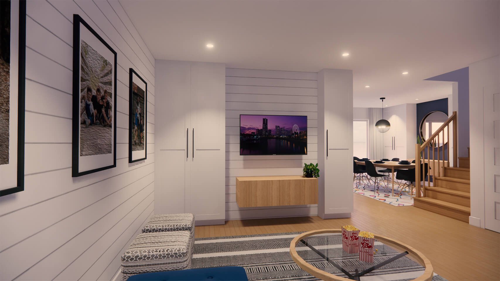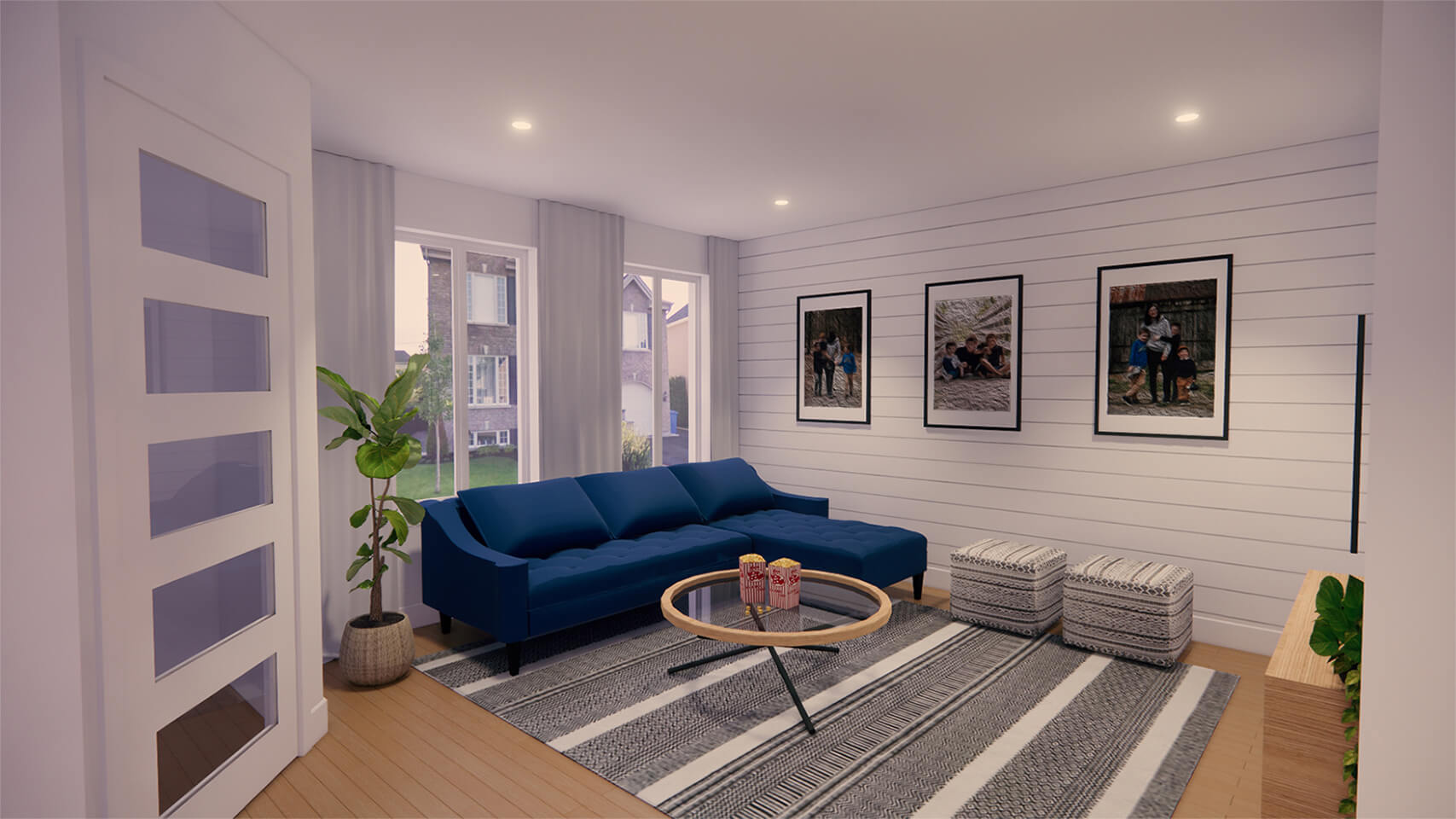 Le choix de matériaux légèrement texturés mais aux couleurs contrastantes laisse une ambiance lumineuse et vivante. L’intégration de la couleur marine, aux armoires de la cuisine ainsi qu’au mobilier, apporte une dose de personnalité à l’ensemble et s’harmonise bien avec les revêtements plus clairs qui composent l’enveloppe des pièces du rez-de-chaussée.
